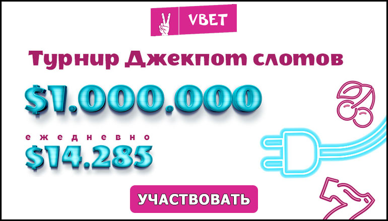 Скорее заходите на сайт казино Вбет (Vbet Casino), где проходит турнир по джекпот слотам. С 9 августа по 17 октября наслаждайтесь красочными видеослотами, поднимайтесь в таблице лидеров и выигрывайте щедрые денежные призы. В рамках соревнования ежедневно будет разыграно 14 285 долларов, ну а общий призовой фонд акции составляет один миллион долларов! Так что, не теряя времени, присоединяйтесь к участникам соревнования и забирайте свою часть от общего призового фонда в турнире по джекпот слотам от казино Вбет!
