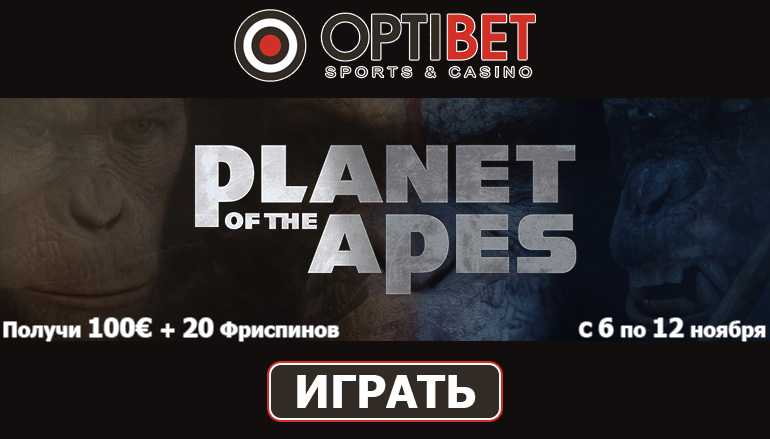 Как получить 100 евро и 20 бесплатных спинов в игре «Планета обезьян» в казино Оптибет