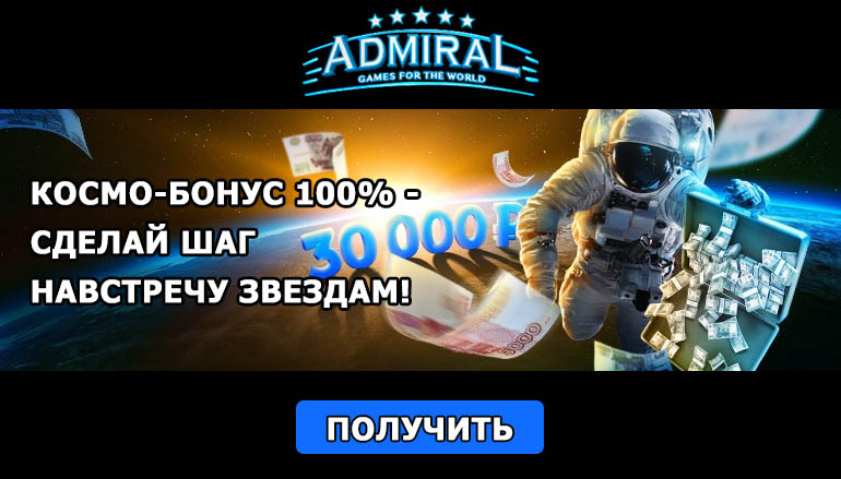 Главное запомните, если Вы хотите получить 100% бонус от внесенной суммы, не выводите деньги до завершения действия предложения. Бонус будет зачислен по окончанию действия предложения, то есть 12 апреля в 19:00 по МСК. Максимальная сумма бонуса составит тридцать тысяч рублей. Участвуйте в праздничной акции ко Дню космонавтики и станьте обладателем внеземных выигрышей от казино Адмирал 777!