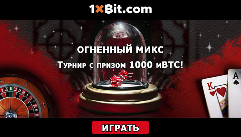 С 27 сентября по 27 октября заходите на сайт игорного заведения 1хБит (1xBit Sport), где проходит зажигательная акция. Занимайте место за любым из столов Live казино Evolution Gaming и выигрывайте часть огромного призового фонда размером в 1000 mBTC! Учтите, в рамках турнира «Огненный микс» от 1хБит будет разыграно десять призов, поспешите забрать один из них!