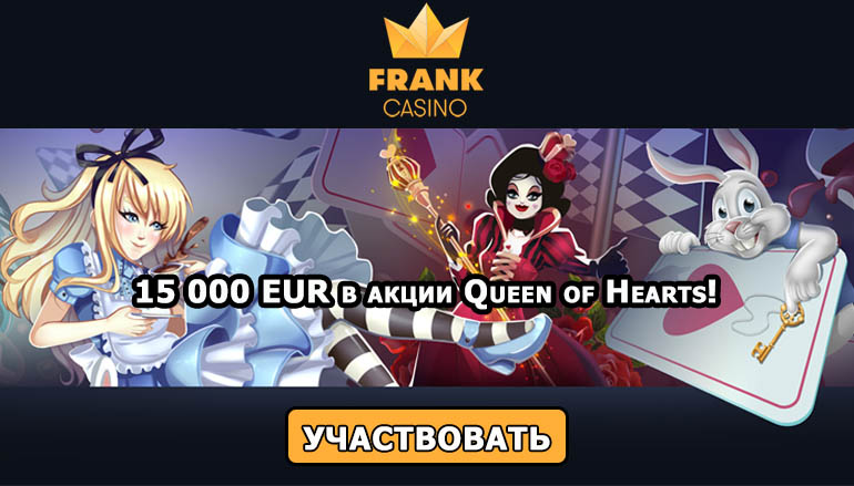 Внушительные призовые и крутые подарки в уникальной акции «Queen of Hearts» от казино Франк (Frank Casino) позволят Вам совместить приятный досуг с материальной выгодой! Не медлите, вступайте в борьбу прямо сейчас! От Вас потребуется самая малость — делать ставки в турнирных слотах и раскрывать скрытые изображения. За каждый раскрытый фрагмент участнику турнира будут начисляться очки. Накапливайте как можно больше очков и становитесь одним из претендентов на крупный выигрыш из щедрого и весомого призового фонда в размере 15 тысяч евро! Покорите «Королеву сердец» в одноименной акции казино Франк и заберите прилагающийся Вам приз!