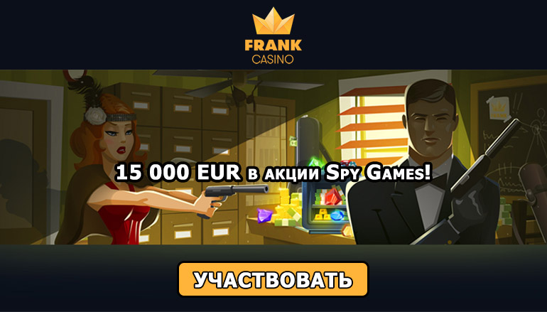 Затрата времени и энергии участников акции «Spy Games» от казино Франк с лихвой будут компенсированы щедрым вознаграждением, которое ждет всех победителей азартной авантюры. Итак, начинайте играть прямо сейчас и становитесь одним из претендентов на победу. Общий призовой фонд турнира в размере 15 тысяч евро заставит затрепетать сердце каждого любителя сайтов онлайн азартных игр, который предпочитает делать ставки в онлайн слотах!