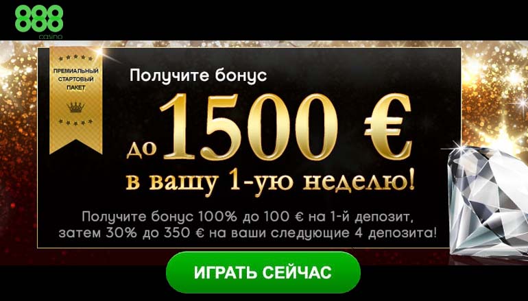 Зарегистрируйтесь в 888казино и Вы получите премиальный стартовый пакет 888казино в размере до 1500 евро в подарок !