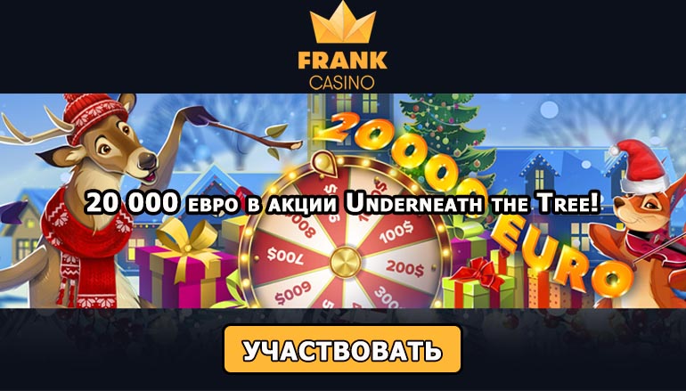 Канун Нового года и Рождества — самое продуктивное время для азартных гемблеров. Ведь наступает пора, когда каждый может сорвать солидный куш, принимая участие в праздничных лотереях и других промо акциях от ведущих БК и сайтов онлайн казино. Порой бывает не просто сориентироваться в таком многообразии заманчивых и щедрых предложений! Но, не надейтесь мы не упростим Вам задачу! Популярное онлайн казино Франк (Frank Casino) дарит всем желающим возможность выиграть до 20 тысяч евро в канун праздников. Вы не ослышались, играя в онлайн слоты в сногсшибательной акции «Underneath the tree» от казино Франк Вы сможете стать обладателем крупных денежных призов и выиграть массу других полезных подарков!