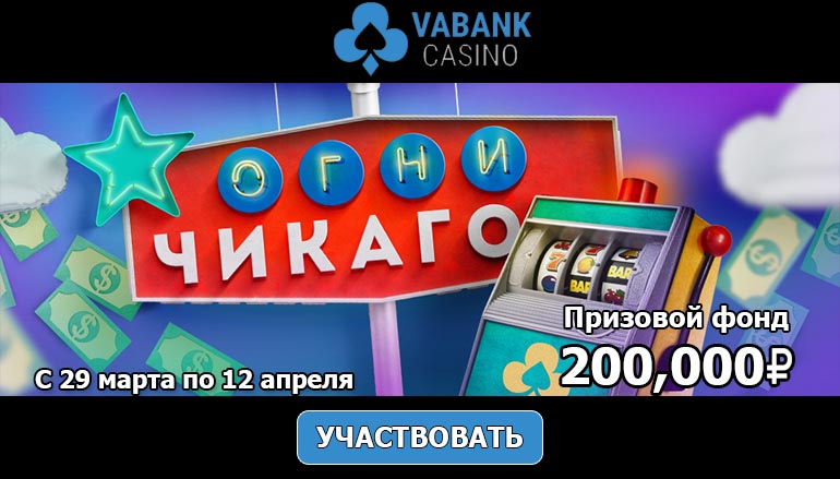 Скорее регистрируйтесь в казино ВаБанк, турнир «Огни Чикаго» стартует 29 марта и продлится до 12 апреля. В этот период активно играйте на турнирных слотах. Выбирайте любой из 232 игровых автоматов. Каждый из них может принести Вам крупный выигрыш и денежный приз от казино ВаБанк! Учтите, что в соревновании зачитываются только ставки размером не меньше 9 рублей.