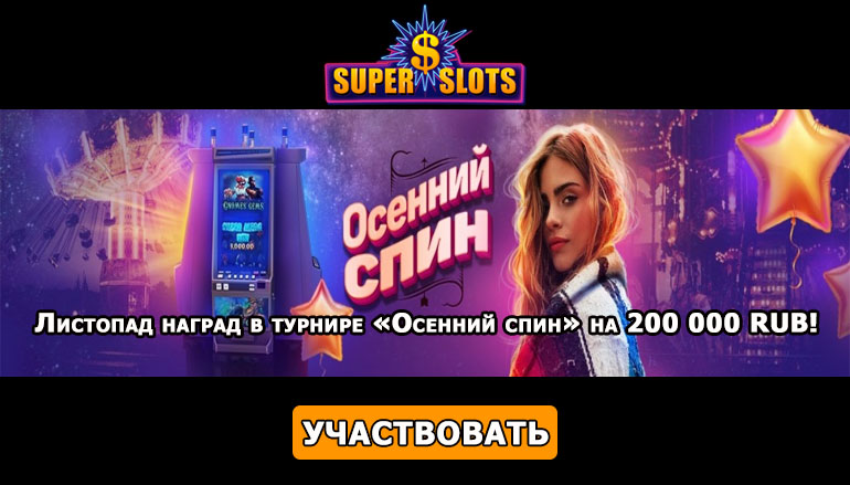 Казино Супер Слотс (Casino Super Slots) предлагает эффективный способ борьбы с осенней хандрой. Игорное заведение проводит новое захватывающее соревнование, где Вы сможете получить не только положительные эмоции и яркие впечатления, но и крупные выигрыши. Участвуйте в промо акции «Осенний спин» от казино Супер Слотс, где Вас ждет листопад наград! Выигрывайте один из пятнадцати денежных призов ноябрьского турнира, и пусть осень станет Вашим любимым временем года!