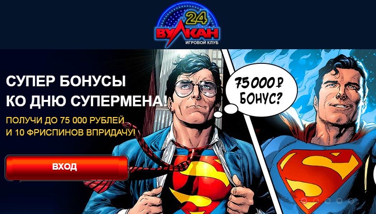 Получи 200%-ый супер-бонус на депозит от казино Вулкан24 в день рождения Супермена! А на сладкое – 10 бесплатных спинов!