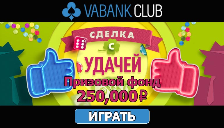 Каждый мечтает, чтобы в жизни его сопровождали везение и успех. Однако далеко не всем улыбается госпожа Удача. Что же сделать для того, чтобы удостоиться благосклонности этой капризной дамы? Казино ВаБанк (VaBank Casino) предлагает Вам заключить сделку. Только сейчас и только в турнире «Сделка с удачей» у Вас есть уникальная возможность подписать договор с повелительницей побед!