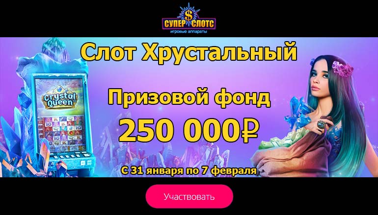 Регистрируйтесь в казино Супер Слотс прямо сейчас! Турнир «Слот Хрустальный» стартует 31 января и завершится 7 февраля. Весь этот период Вам необходимо играть на турнирных слотах. Казино Супер Слотс предлагает Вам на выбор более 250 игровых автоматов, которые доступны как на ПК, так и в мобильной версии сайта казино. По правилам данной промо акции онлайн казино размер минимальной ставки составляет 10 рублей.