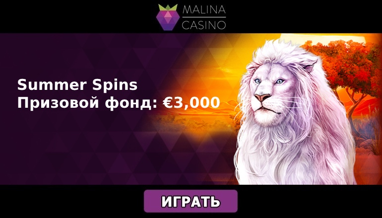 До 30 июня включительно заходите на сайт казино Малина (Malina Casino), где проходит летний турнир. Играйте в турнирные слоты компании Spinomenal и набирайте баллы. В конце турнира победители разделят между собой призовой фонд размером в 3000 евро! Поспешите забрать один из щедрых денежных призов и поднять себе летнее настроение!