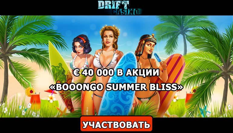 Если Вы готовы почувствовать невероятный драйв, то с 11 июня по 2 июля заходите на сайт казино Дрифт (Drift Casino), где проходит сетевая акция компании Бооонго. Играйте в самые яркие слоты известного разработчика игрового софта, зарабатывайте турнирные очки, занимайте одно из призовых мест и забирайте часть огромного призового фонда! Подарите себе незабываемый летний отдых благодаря крупным денежным выигрышам в турнире «Booongo Summer Bliss» от казино Дрифт!