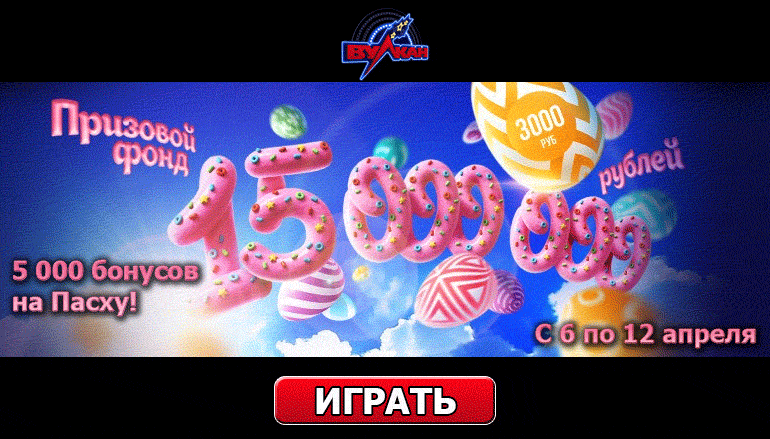 Присоединяйтесь к участникам пасхальной акции прямо сейчас. Вас ждут щедрые бонусы по 3 000 рублей. Каждый участник может получить столько бонусов сколько пожелает! Подарков хватит всем, ведь общий призовой фонд праздничной акции составляет целых 15 миллионов рублей! Выиграйте один или несколько бонусов на Пасху от казино Клуб Вулкан! Заберите столько призов, сколько успеете!
