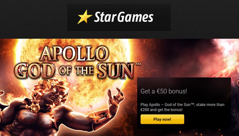 Не пропусти этот божественный шанс! У тебя есть время до полуночи в предстоящее воскресенье, чтобы делать ставки на общую сумму до 200 евро на популярном слоте «Аполлон – Бог солнца» и уже в понедельник получить 50 евро по бонусу на депозит от казино Стар Геймс в подарок!