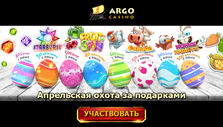 Начался второй месяц весны, а с ним и новый этап раздачи подарков от казино Арго (Argo Casino). Каждый день – новый бонус! Присоединяйтесь к участникам апрельской промо акции прямо сейчас и соберите все 7 подарков и 100 фриспинов в придачу. Этот месяц принесет Вам множество приятных сюрпризов и щедрых призов. Поспешите, Апрельская охота за подарками в казино Арго уже началась!