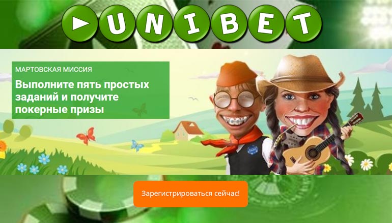 Пусть это станет Вашей «мартовской миссией»! Ведь только в этом месяце у Вас будет уникальная возможность получить солидные денежные призы за заработанные бонусные очки, выполнив простые покерные задания в различных играх! Участвуйте в новой акции Юнибет Покер и выиграйте бесплатные билеты на покерные турниры с гарантированным призовым фондом до 3 тысяч евро!
