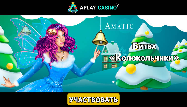 Скорее регистрируйтесь в казино Азарт Плей и присоединяйтесь к участникам новогоднего турнира. Битва «Колокольчики» проходит с 25 ноября по 1 декабря включительно. Все что от Вас требуется – это играть в красочные слоты от Amatic каждый день с 12:00 до 23:59 по МСК и набирать турнирные очки. Минимальная ставка для участия в соревновании составляет 1 евро.