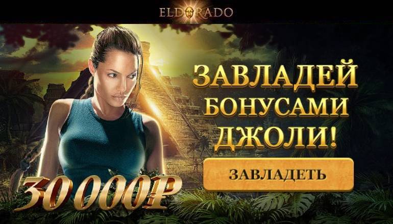 В период с 4 по 10 июня заходите на сайт казино Эльдорадо (Eldorado Casino), участвуйте в тематической акции ко дню рождения Анджелины Джоли и получайте гору выигрышей. Вас ждет целых три бонуса на общую сумму 30 тысяч рублей, а также бесплатные вращения в подарок. Не теряя времени отправляйтесь за приключениями и бонусами в клуб Эльдорадо вместе с расхитительницей гробниц!