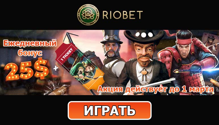 На этой неделе многие сайты онлайн казино в России подготовили увлекательные турниры и соревнования ко Дню защитника Отечества. Всех посетителей казино РиоБет (Riobet Casino) также ждут щедрые призы и подарки в праздничной промо акции, приуроченной к 23 февраля. Не упустите возможность получить ежедневный бонус 25 долларов в казино РиоБет! Поспешите данное предложение действительно до 1 марта!