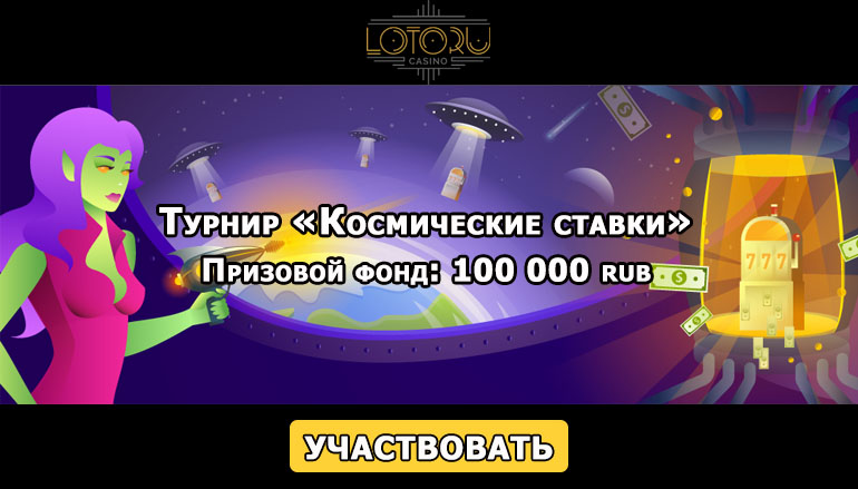 Фантастический розыгрыш призов в турнире «Космические ставки» от казино ЛотоРу (LotoRu Casino). Ощутите состояние невесомости, срывая крутые денежные призы в сногсшибательной промо акции от популярного онлайн казино. Космическое турне по внеземным цивилизациям подарит Вам массу новых ощущений и внушительные призы в придачу.