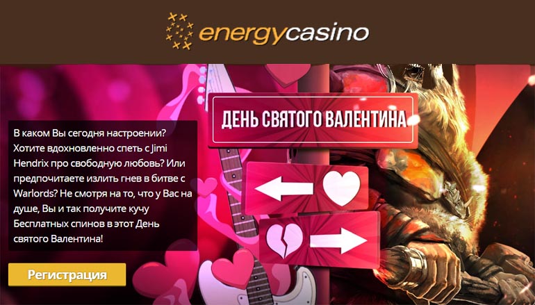 Похоже, что казино Энерджи заботится о Вас, не смотря на то, в каком настроении Вы пребываете – романтическом и наполненном любовными моментами с песнями Jimi Hendrix под луной, или же Вы увлечены гневной битвой в Warlords Crystals of Power… В любом случае, Вас ждут бесплатные спины от казино Энерджи в качестве подарка в День влюбленных! Другие детали Вы сможете найти в нашем Обзоре казино Энерджи.