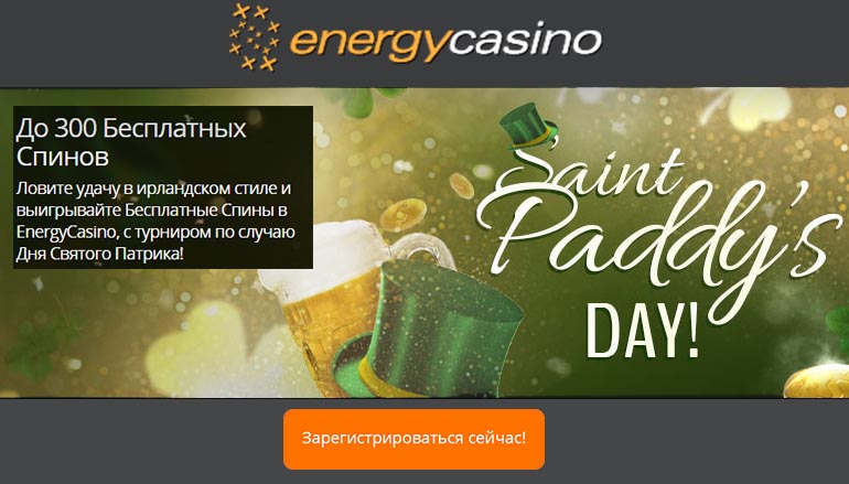 Итак, купите себе бутылочку-другую ароматного темного эля, присоединяйтесь к турниру казино Энерджи и пусть удача ирландцев будет с Вами! И не забудьте о магической силе четырехлистного клевера, ведь куча бесплатных спинов от Святого Патрика уже ждут Вас!