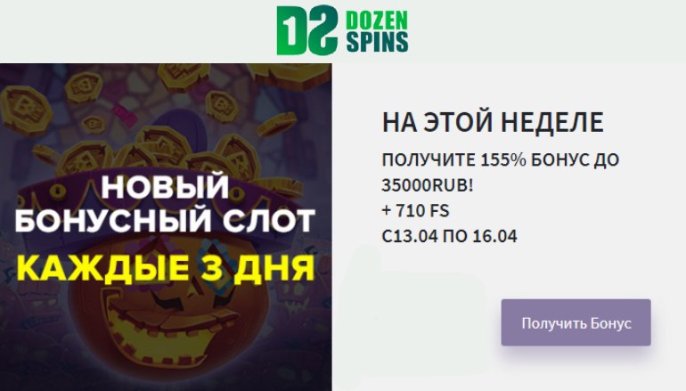 В период с 13 по 16 апреля на сайте казино ДозенСпинс действует специальное предложение. Все зарегистрированные игроки могут получить еженедельный бонус от казино ДозенСпинс общим размером до 155% от внесенного депозита, а также 710 бесплатных спинов для слота Fire Toad.