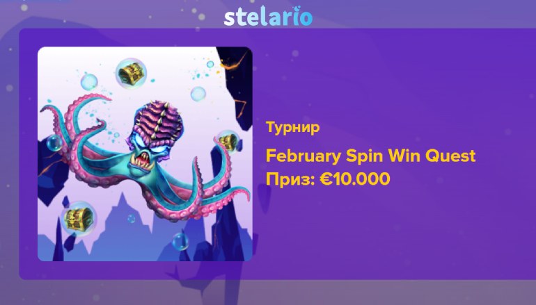 Готовы получить максимум удовольствия от посещения онлайн казино, играя в красочные слоты? Тогда скорее присоединяйтесь к потрясающему турниру «February Spin Win Quest» в казино Стеларио. Этот месяц подарит вам возможность насладиться лучшими играми, а также приблизит вас к желанному крупному выигрышу. Ведь призовой фонд соревнования составляет 10 тысяч евро, и именно вам может достаться самый лакомый кусок этого жирного пирога!