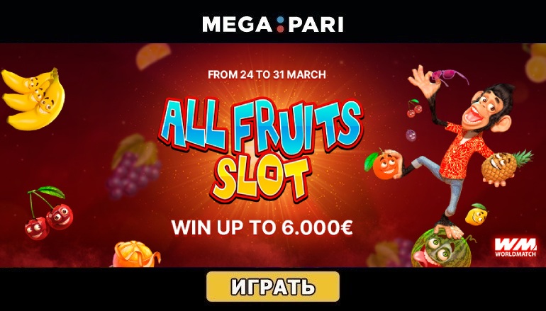 Скорее регистрируйтесь на сайте Мегапари (Megapari) и присоединяйтесь к новому увлекательному состязанию. Фруктовый турнир в Мегапари стартует 24 марта и завершится 31 марта в 23:59 GMT. Для участия в акции Вам нужно играть в турнирные слоты провайдера WorldMatch, совершая ставки на реальные деньги. В соревновании задействованы пять игр на фруктовую тематику, среди них: Banana King, Fruits Evolution, Just Hot, Funny Monkey и Scary Fruits.