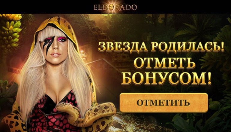 Гага-бонус в казино Эльдорадо можно получить только один раз в рамках данного предложения. Поэтому не теряя времени присоединяйтесь к промо акции, приуроченной ко дню рождения одной из самых эпатажных звезд современности. Забирайте 20 тысяч рублей и 50 фриспинов под звуки знаменитых хитов Леди Гага! Ну а для того, чтобы узнать об остальных бонусных предложениях и промо акциях данного игорного заведения, ознакомьтесь с нашим обзором казино Эльдорадо.