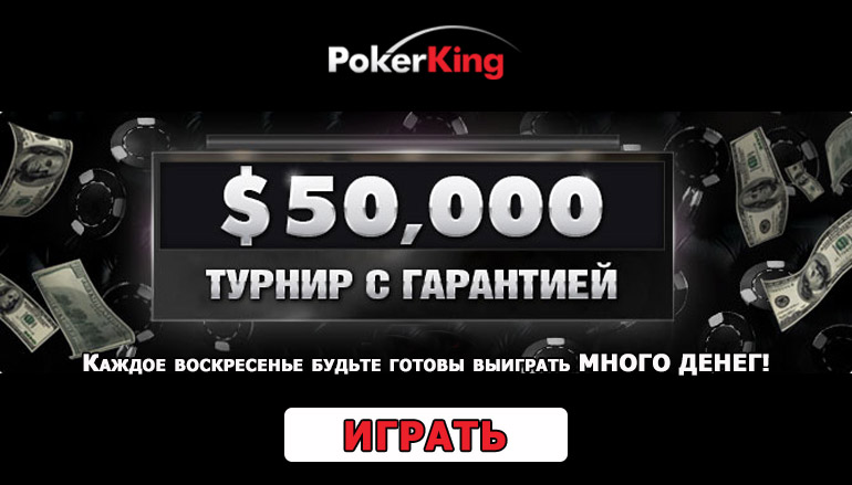 Если ты хочешь стать обладателем победных 50 тысяч долларов, играя в онлайн покер, то настало время зарегистрироваться в ПокерКинг! Именно этот онлайн покер рум дает возможность каждое воскресенье принимать участие в крупных турнирах с щедрыми призовыми. Турнир с гарантией $50,000 стартует каждое воскресенье в 23:00 GMT (или понедельник 03:00 по московскому времени). Бай-ин составляет 200 + 15 долларов.