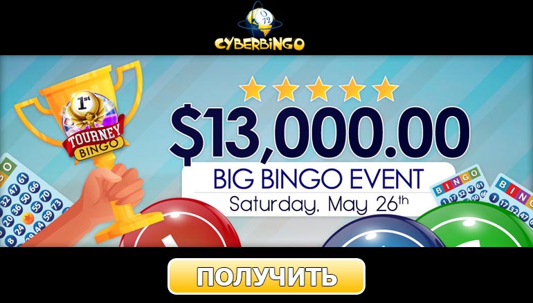 Не пропусти грандиозный турнир Big Bingo стоимостью 13 000 долларов США в комнате Tourney Bingo! Зарегистрируйся в казино Кибер Бинго, чтобы принять участие в субботней промо акции! Она пройдет 26 мая 2018 года и продлится всего час – с 23:00 по московскому времени до полуночи. Сделай депозит и приобрети лотерейный билет, стоимостью всего в 2 доллара! За время действия турнира ты сможешь принять участие сразу в трех захватывающих играх бинго с гарантированными призами в три тысячи долларов!
