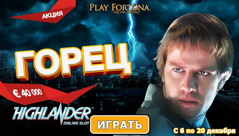В преддверии новогодних праздников казино Плей Фортуна (Casino Play Fortuna) подготовило множество потрясающих подарков для всех любителей азарта. Примите участие в турнире «Горец» с 6 по 20 декабря и выиграйте один из 350 денежных призов! Общий призовой фонд соревнования составляет 40 тысяч евро! Перед таким заманчивым предложением не устоит ни один посетитель сайтов онлайн казино в России. Играйте на слоте «Горец» и выигрывайте до 40 тысяч евро от казино Плей Фортуна!