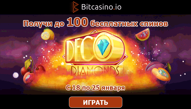 Любителям классических игровых автоматов советуем не пропустить новую потрясающую акцию казино БитКазино (BitCasino). Для того, чтобы громко отметить запуск нового слота «Бриллианты деко» (Deco Diamonds), БитКазино дарит Вам до 100 фриспинов для этой фантастической игры! Получить бесплатные вращения очень просто – делайте депозит, играйте на новом слоте «Бриллианты деко» и получайте до 100 фриспинов от БитКазино!