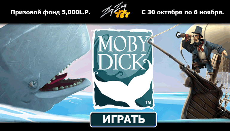 Настало время отправиться в морское путешествие на поиски белого кита! В этом Вам поможет казино ЗигЗаг 777 (ZigZag 777 Casino). Примите участие в турнире «Слот недели» и все семь дней наслаждайтесь игрой на новом слоте Моби Дик. У всех посетителей сайтов онлайн казино в России есть возможность выиграть до 5 тысяч поинтов от казино ЗигЗаг 777!