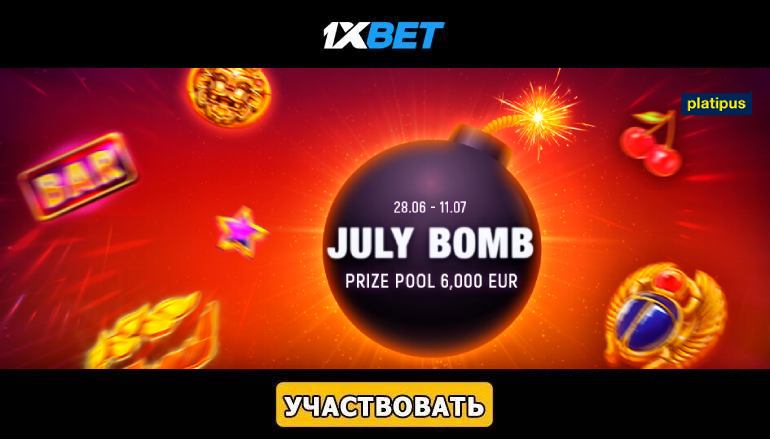 Отличные новости для всех любителей видеослотов! В этот понедельник стартовал захватывающий турнир «Июльская бомба» в казино 1хБет! Компания Platipus и казино 1хБет приглашают Вас присоединяться к невероятному июльскому турниру. Потрясающие слоты и призовой фонд в размере 6 тысяч евро обещают Вам массу удовольствия! Не упустите свой шанс выиграть по-крупному!