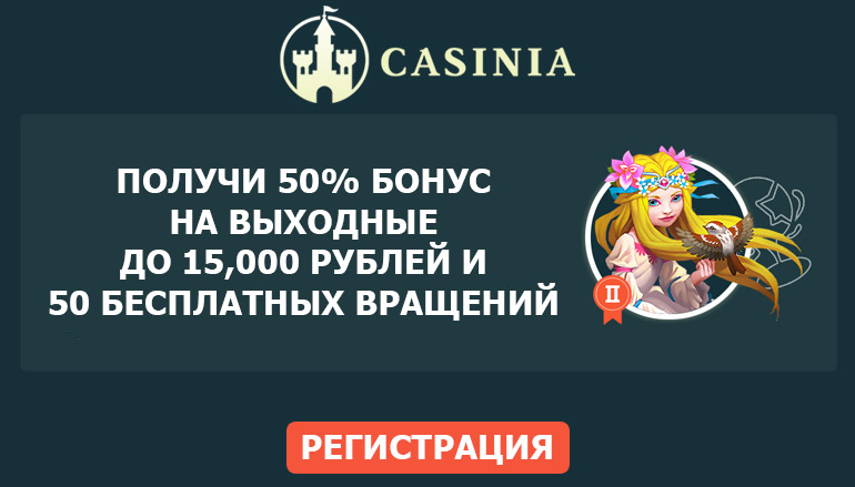 Каждые выходные получай 50% бонус и 50 фриспинов от казино Казиния!