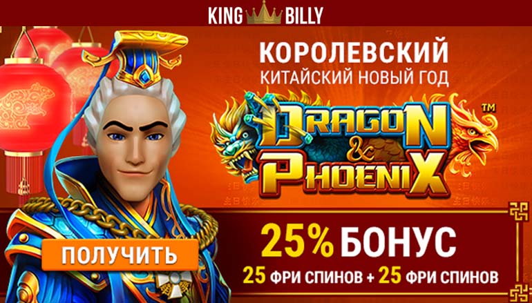 Помимо денежного бонуса все участники акции дважды получат по 25 фриспинов на слоте Dragon & Phoenix. При этом, первый пак из 25-ти фриспинов будет выдан сразу с депозитом, а второй будет выдан по истечению 23 часов после отыгрыша вейджера. Данный бонус доступен единожды до 31 января, так что поспешите воспользоваться этим выгодным предложением. Отпразднуйте Китайский Новый год в Королевстве, где Вас ждет очередная порция подарков! С другими подробностями этой праздничной акции Вы можете ознакомиться на сайте казино Кинг Билли.