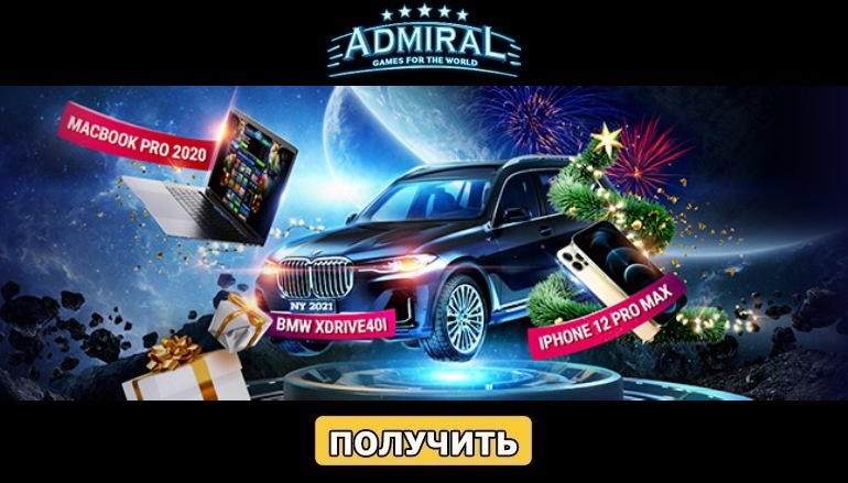 В период с 10 по 31 декабря заходите на сайт казино Адмирал (Casino Admiral) и участвуйте во всех новогодних мероприятиях, в рамках которых можно получить лотерейные билеты. Чем больше у Вас будет билетов, тем выше Ваши шансы заполучить один из трех главных призов лотереи: автомобиль BMW, ноутбук MacBook Pro, смартфон iPhone 12 Pro Max.