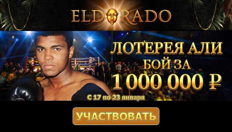 Мохаммед Али был одним из самых известных спортсменов в истории мирового бокса. Специально ко дню рождения великого боксера казино Эльдорадо24 (Eldorado24 Casino) запускает лотерею «Миллион от Али». Покупайте лотерейные билеты и принимайте участие в потрясающем турнире. Не упустите шанс выиграть один миллион рублей в лотерее «Миллион от Али» в казино Эльдорадо24!