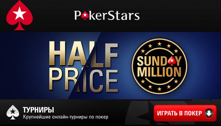 Только 18 июня и только на Покер Старс! Благодаря уникальной промо акции онлайн покер рума, в легендарном турнире Sunday Million ты сможешь сыграть за половину стандартного бай-ина в размере 215 долларов!