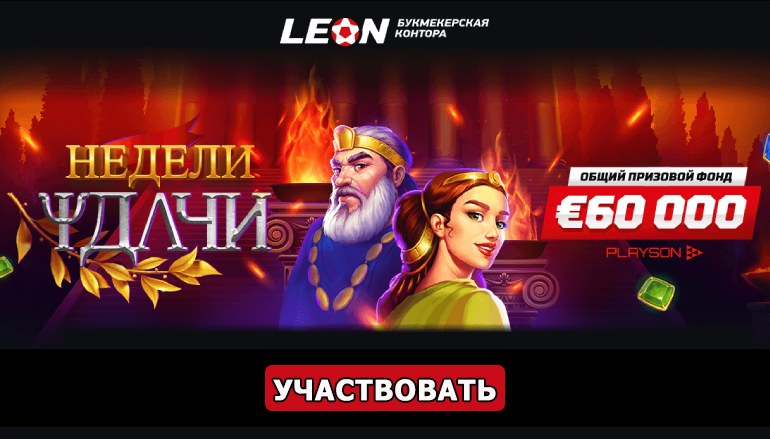В период с 13 по 29 мая заходите на сайт Леон Бет (Leon Bet) и участвуйте в захватывающей промо акции. Наслаждайтесь красочными слотами компании Playson, набирайте очки за выигрыши, чтобы стать одним из 150 лидеров недели! Крутите топовые слоты провайдера каждые выходные и выигрывайте часть призового фонда в размере 60 тысяч евро!