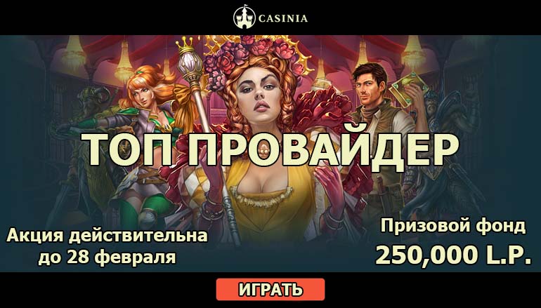 Наступил февраль, а это значит, что в казино Казиния (Casinia Casino) сменился провайдер месяца. Ежемесячный турнир «Топ провайдер» уже стартовал. Скорее присоединяйтесь к участникам соревнования! Вас ждут увлекательные приключения, любимые видео слоты и ценные призы. Не упустите возможность отлично провести последний месяц зимы, да еще и получить подарки! Призовой фонд турнира «Топ провайдер» в казино Казиния составляет 250 тысяч пунктов лояльности!