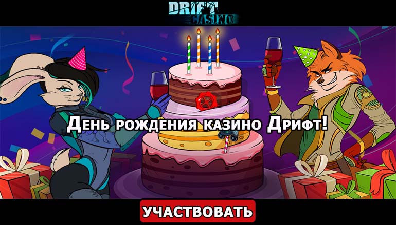 Казино Дрифт (Drift Casino) стало на год старше, а это значит, что скоро состоится празднование именин! День рождения – это всегда веселье и подарки, однако в данном случае подарки получит не именинник, а все гости торжества. Участвуйте в праздничном турнире по случаю именин любимого игорного заведения, и получайте приятные сюрпризы и щедрые призы!