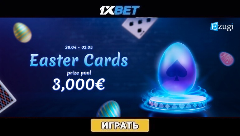 Турнир «Пасхальная открытка» в казино 1хБет стартует 26 апреля и завершится 2 мая в 23:59 GMT. В этот период Вам нужно совершать ставки на реальные деньги в играх компании Ezugi: Blackjack English, Blackjack Ru/Eng и Blackjack Ru/Eng 2.