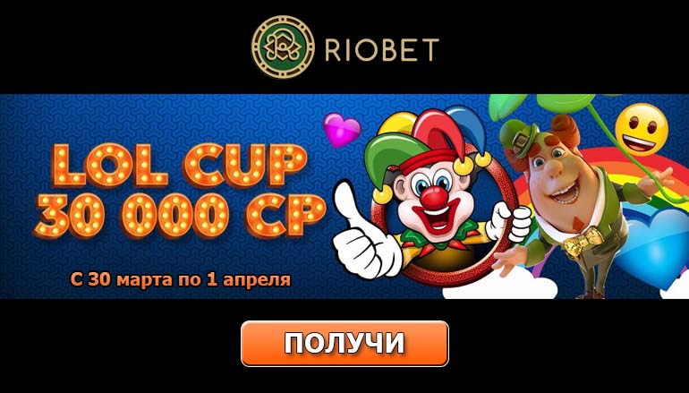 Не понаслышке знаешь, что такое настоящий искренний смех? Настало твое время зарегистрироваться в казино РиоБет и принять участие в турнире «LOL Cup»! Предложение получить 30 тысяч комп-поинтов в турнире казино РиоБет действует в период с 30 марта по 1 апреля 2018 года. Пополни за это время счет на сумму в размере 50 евро (2 mBTC или 3 тысяч рублей), отыграй бонус на депозит и получи один билет на турнир.