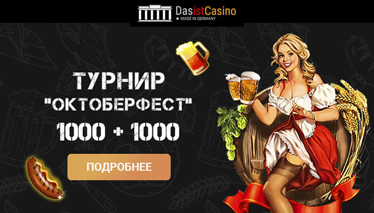 В Мюнхене начинается очередной Октоберфест, а в казино Дас Ист (Das Ist Casino) – очередной турнир. Неважно, где Вы находитесь, в Баварии или дома, присоединяйтесь к празднованию всемирно известного фестиваля пива. С 21 сентября по 6 октября участвуйте в акции «Октоберфест» от казино Дас Ист и выигрывайте призы!