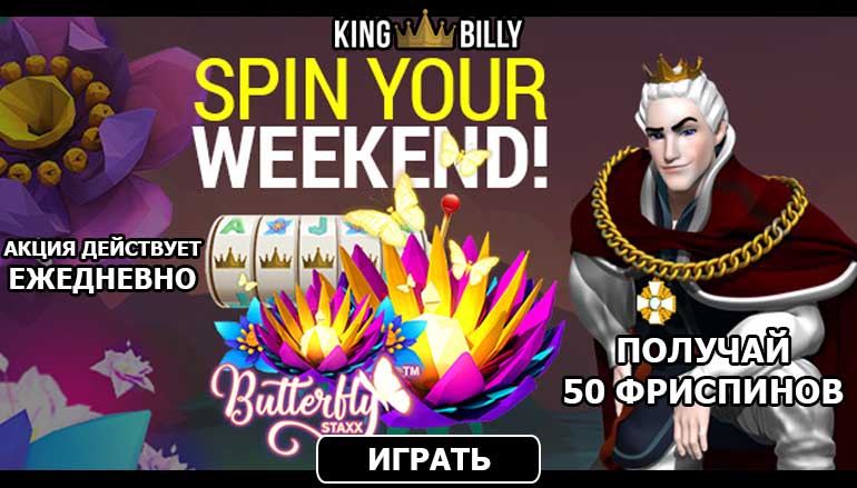 Каждый день в казино Кинг Билли проходит акция Spin and Win. Это значит, что ежедневно у Вас есть шанс получить бесплатные вращения! Пополните свой игровой счет на 1000 рублей, и Вы получите в подарок 20 фриспинов на красочном слоте компании НетЭнт «Стеки бабочек» (Butterfly Staxx). Если же Вы совершите депозит на сумму 2500 рублей и больше, то Вам полагается 50 бесплатных вращений. Для получения данного бонуса Вам необходимо ввести промо код SPIN.