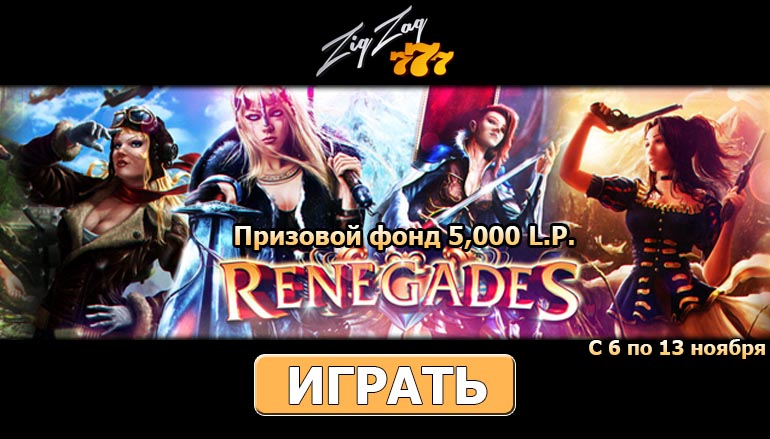 Если Вы еще не зарегистрированы на сайте онлайн казино ЗигЗаг 777, то сейчас самое время это сделать. Только после этого Вы можете стать участником турнира «Слот недели». Играйте с 6 по 13 ноября на увлекательном слоте Renegades, соблюдая некоторые условия промо акции онлайн казино. Так, минимальная сумма ставок составляет 1000 рублей, а размер депозита в период проведения турнира должен быть как минимум 500 рублей. Только 10 участников турнира станут победителями и разделят между собой призовой фонд в 5 тысяч поинтов. Более подробную информацию об этом и других турнирах Вы найдете на сайте онлайн казино ЗигЗаг 777!