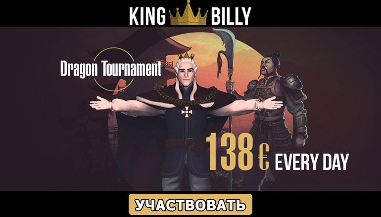 Играйте в любимые слоты и получайте шанс выиграть до 138 евро в «Королевском турнире Дракона» от Кинг Билли (King Billy Casino). Щедрая промо акция от популярного онлайн казино дарит возможность своим постоянным и потенциальным посетителям каждый день выигрывать денежные призы. Итак, каждый день на весь период действия акции, делайте ставки на любимых слотах и получайте возможность стать финалистом уникального предложения от Кинг Билли.
