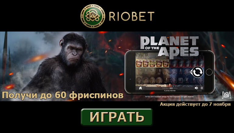 Всем любителям знаменитого фильма «Планета обезьян» казино РиоБет (Riobet Casino) предлагает принять участие в увлекательной промо акции. Участники смогут не только насладиться игрой на новом слоте «Планета обезьян» (Planet of the Apes), но и получить в подарок бесплатные вращения. До 7 ноября у Вас есть уникальная возможность получить до 60 фриспинов на новом слоте «Планета обезьян» в казино РиоБет!